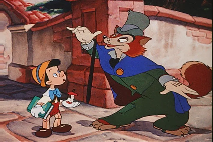 Take, for example, Honest John (my favorite character). He’s the shady con man who tricks Pinocchio into skipping school and then sells him into Stromboli’s traveling circus as his star attraction: The Amazing Puppet Without Strings! It’s remarkably odd, and a bit disturbing, that Honest John is not a human, but rather a human-sized, anthropomorphic fox. How strange. Pinocchio takes place in a human world (more or less), but Honest John is an animal.